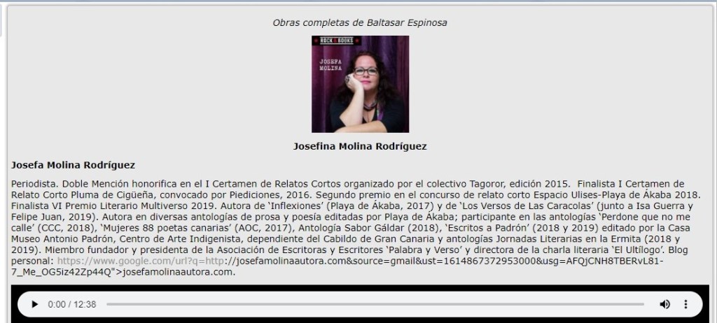 Reseña sobre ‘Obras Completas (1962-2011) de Baltasar Espinosa’ en Canarias 7 ESCUCHA LA RESEÑA BALTASAR ESPINOSA Reseña en LA REVISTA LITERARIA TRASDEMAR