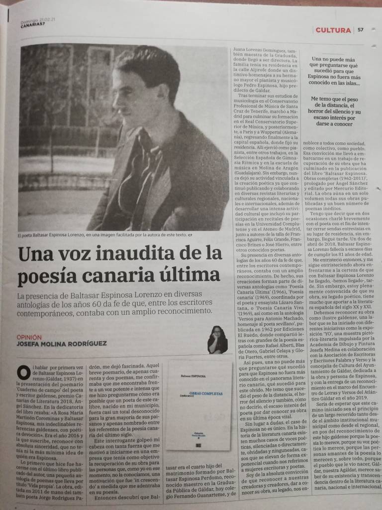 Reseña sobre ‘Obras Completas (1962-2011) de Baltasar Espinosa’ en Canarias 7