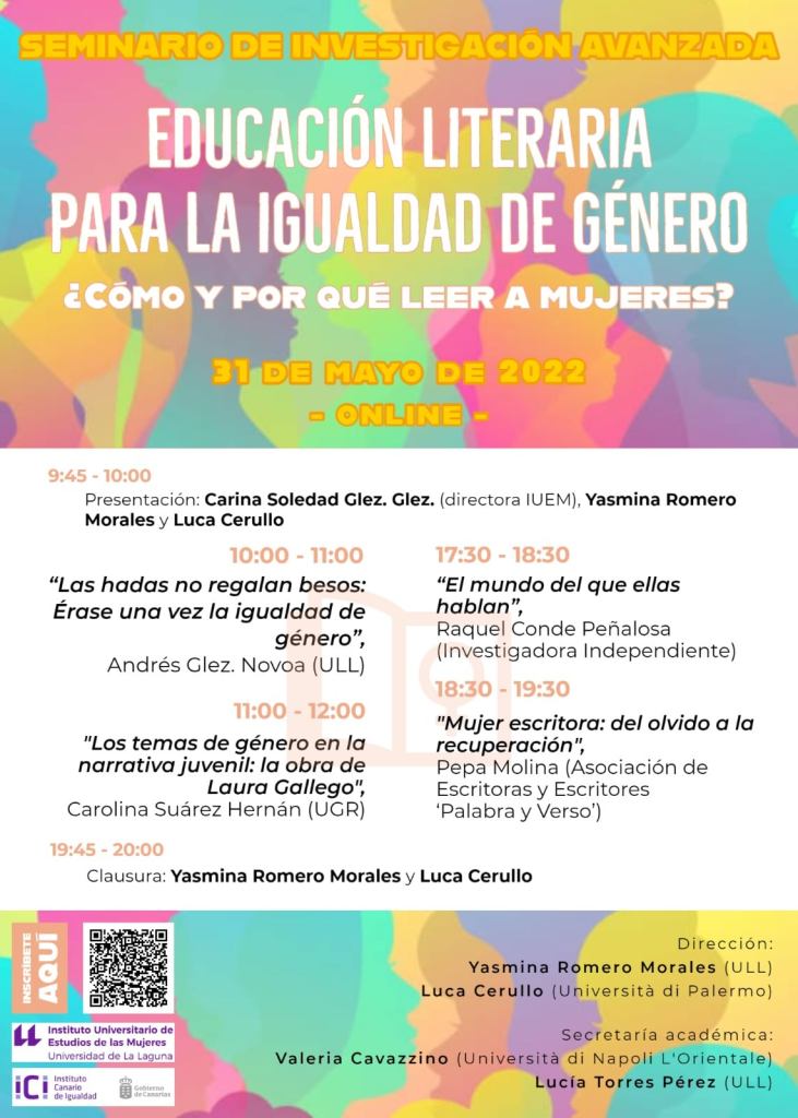 El 31 de mayo del 2022 tendrá lugar el Seminario de Investigación Avanzada Educación literaria para la igualdad de género. ¿Cómo y por qué leer a mujeres? que organiza el Instituto Universitario de Estudios de las Mujeres de la ULL y que dirige Yasmina Romero, de la Universidad de La Laguna (Canarias), junto a Luca Cerullo de la Universidad de Palermo (Italia).
