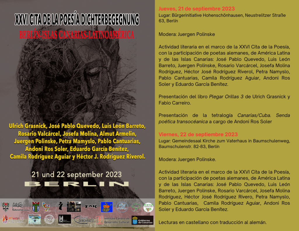 Berlín acogerá del 8 al 23 de septiembre la XXVI Cita de la Poesía 2023 (XVVI Dichterbegegnung Berlin-Spanien-Lateinamerika), un evento que contará con la presencia de un destacado grupo de poetas procedentes de las islas Canarias.