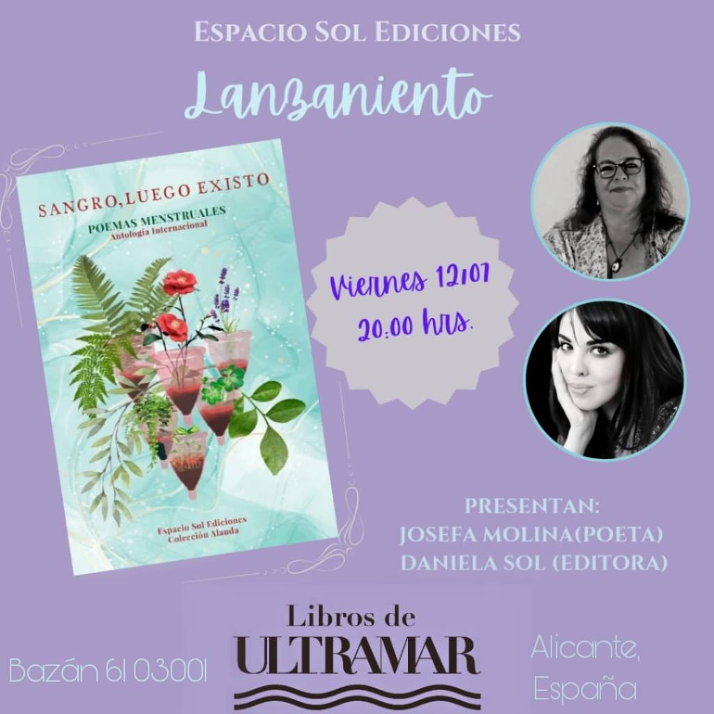 Además, asistiré al lanzamiento en España de la antología colectiva ‘Sangro, luego existo’, junto a la editora de Espacio Sol Ediciones de Chile, Daniela Sol, impulsora de esta obra colectiva.