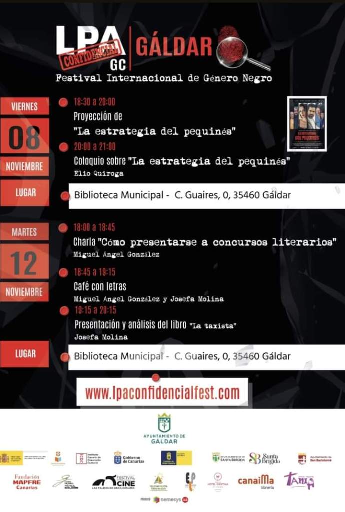 Les anuncio con ilusión las próximas citas que tendremos con mi novela ‘LA TAXISTA’ en el marco del Festival de Género Negro LPA Confidencial. Apunten las citas y no se pierdan el Festival.